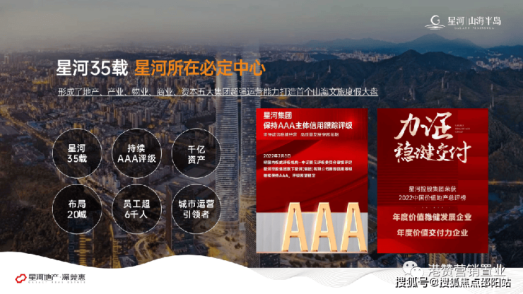 结合星河产业、置业、金融四大产业集团超强运营能力打造首个山海文旅度假大盘。同时,星河因持续兑现承诺而更有信誉,蝉联AAA信用评级;星河山海半岛,致力于提供星河最优质度假体验,开启山海的另一种生活方式,阅过世界,心归山海。