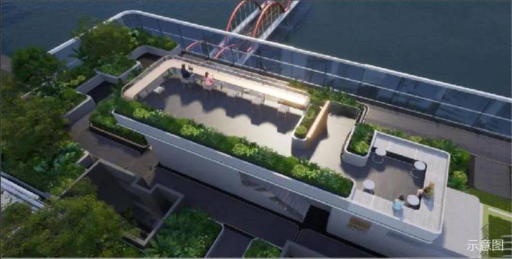 渗透式建筑景观规划——在户外空间融入自然元素的无障碍设计、临近建筑周边的会客厅场地,形成自然景观由外至内的延伸,让滨江樾业主在享受会客厅的休闲时光时,能与城市核心的自然之美,不经意相逢。