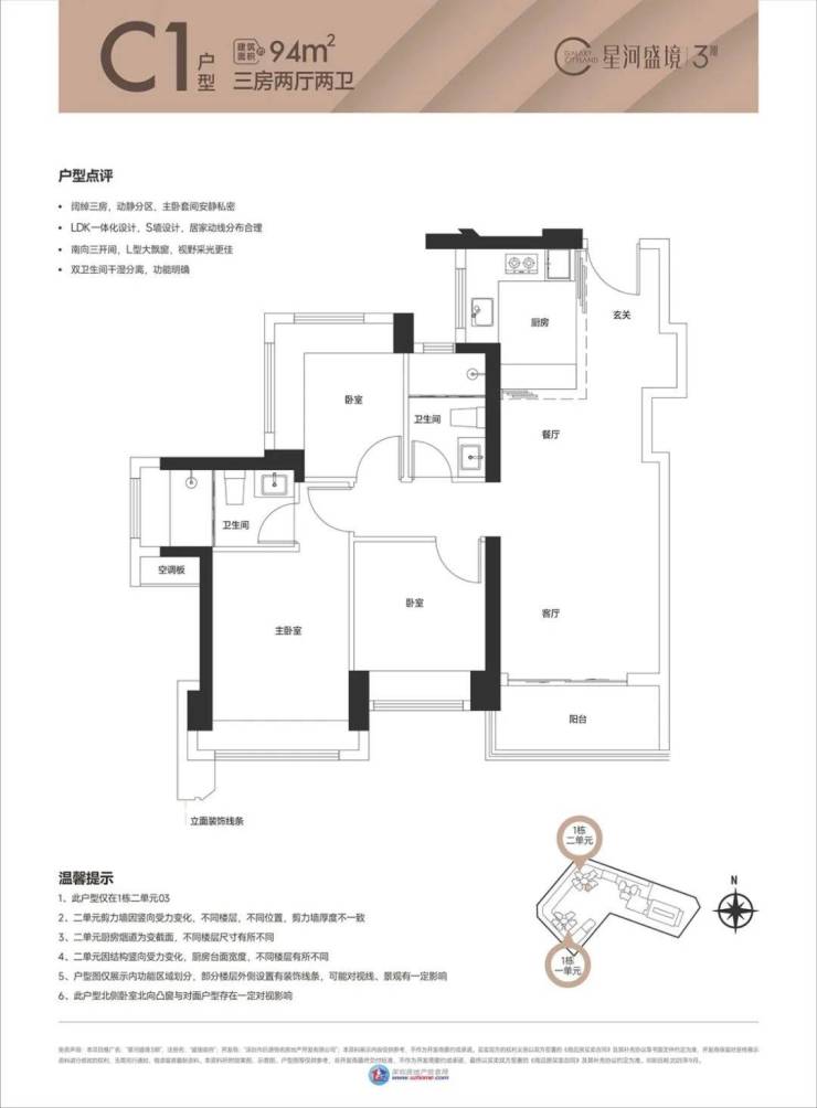 户型设计精致合理,空间利用率高,如83-87㎡的3房2厅2卫,设计为经典竖厅格局,客厅实测3.14米开间,LDKB一体化,S墙设计预留冰箱卡槽位,三开间朝南,3个卧室分别做到了主卧10.8㎡/次卧8.65㎡/次卧6.28㎡(实测面积,不含墙体),U型灵动式厨房,卫生间干湿分离,得房率约76-81%(不含赠送),西南朝向。