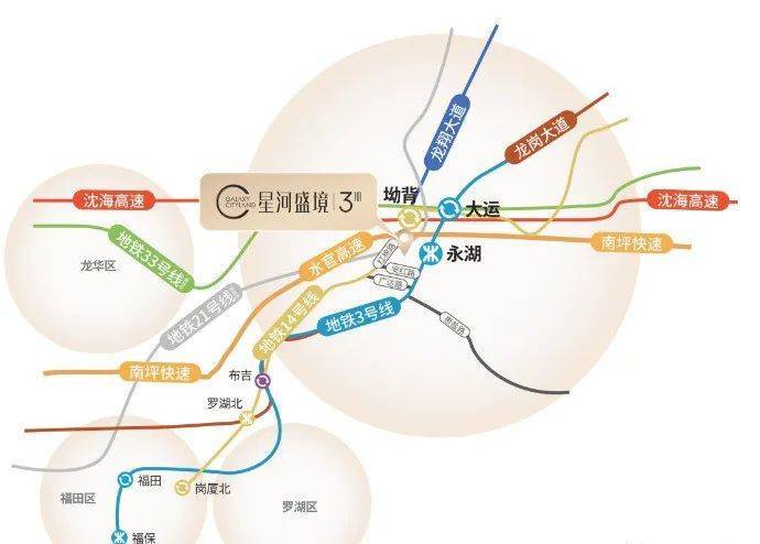 星河·盛境三期傲踞深圳龙岗横岗核心地段,坐拥无可比拟的地理优势。轻松步行即达地铁3号线永湖站(约600米)与即将通车的14号线坳背站(约1.1公里),构建高效出行网络。更瞩目的是,项目前瞻未来交通规划,紧邻规划中的地铁21号线与33号线交汇点,未来出行将无缝连接深圳各大区域,尽享便捷生活圈。