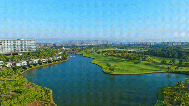 这片南中国最后的热带海岸度假地,空气优良率年均达99%以上,每一口呼吸都是那么清新惬意,沿着海岸线前行,鉴湖·蓝湾高尔夫映于眼前,这座占地约1300亩,由大海、湖泊、沙丘、三角梅、爱情草组成的热带花园林克斯球场,如同给自然留白,湖畔澄碧与海天相映,大地保留原初的美,风景如画卷流淌。