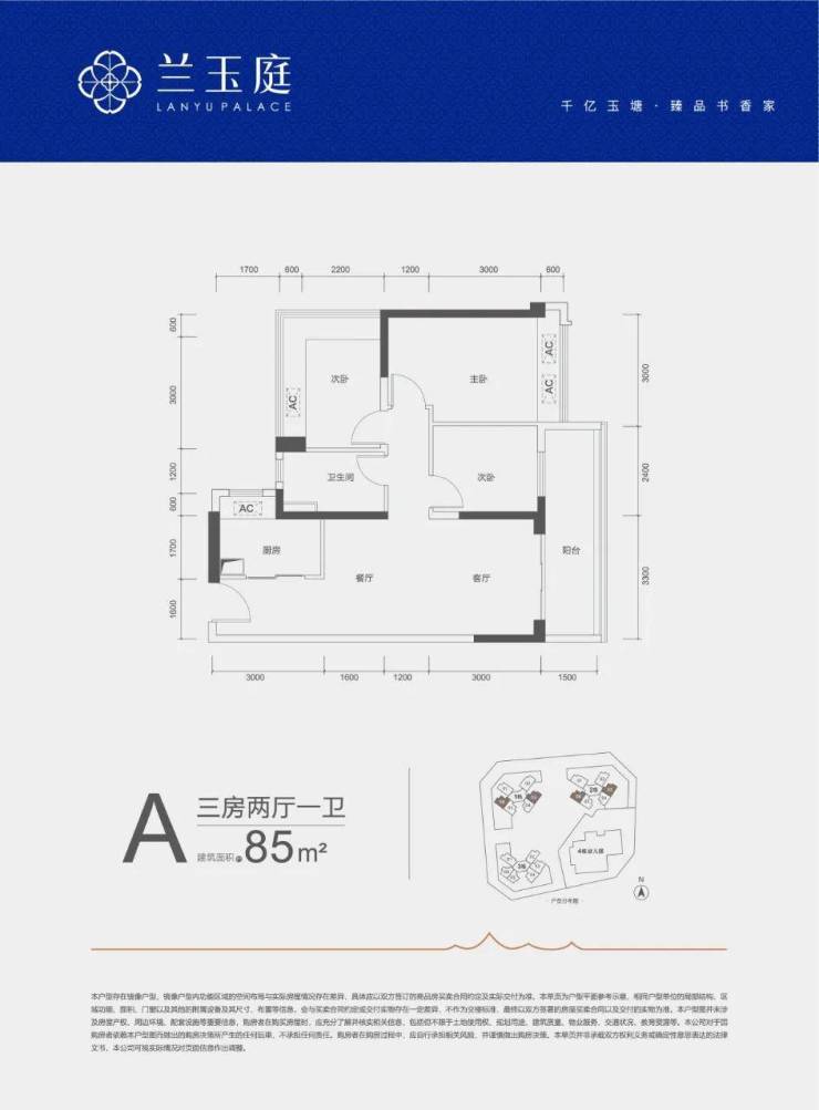 85㎡的3房2厅1卫,A户型,设计的是竖厅格局,客厅开间3.3米,LDKB一体化,三开间朝南,3个卧室分别做到了3米/2.8米/2.4米的宽度,客厅连接次卧出5.7米长的大阳台,L型厨房,得房率约79%(不含赠送),西南或东南经向。