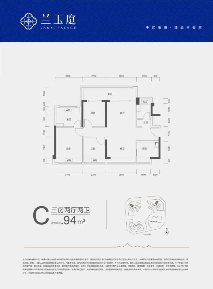 94㎡的3房2厅2卫,C户型,设计的是竖厅南北通透格局,客厅开间3.5米,3个卧室分别做到了3.1米/2.7米/2.7米的宽度,客厅连接次卧出6.2米长的大阳台,U型厨房,公卫三段式分离,得房率约79%(不含赠送),阳台主朝西北或东北向。
