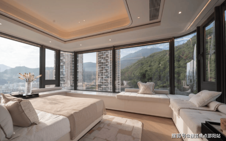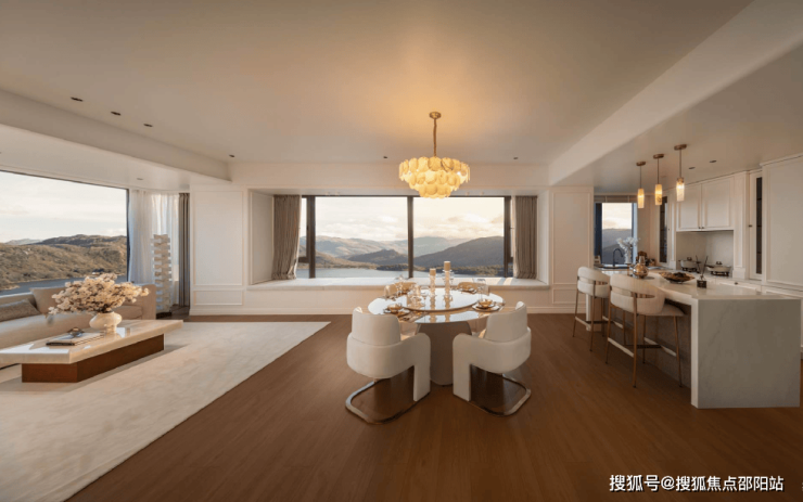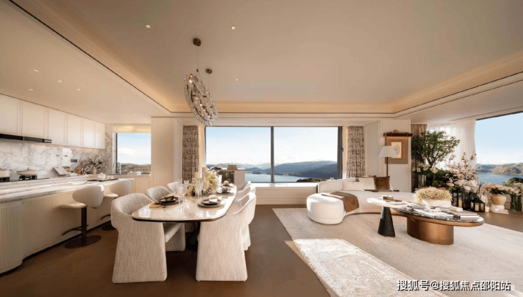 拥揽270°环幕视野与全景采光,结合社交化格局设计,不仅最大化收纳山海盛景,更营造出融合家庭互动、亲朋共聚的丰盛场域。