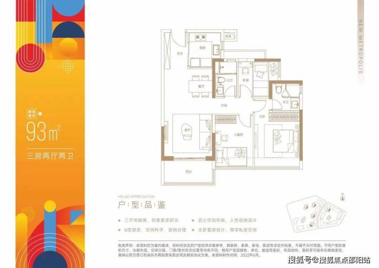 93㎡的3房2厅2卫,价格280-290万左右。设计的是经典竖厅格局,动静分区,客厅3.6米开间,餐客厅一体化,三开间朝南,U型厨房,得房率:86.41%(包含赠送),有西南、东南朝向。