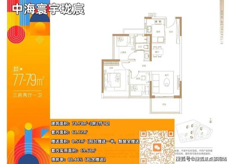 79㎡的3房2厅1卫,价格235-240万左右。设计的是经典竖厅格局,动静分区,客厅3.3米开间,餐客厅一体化,U型厨房,卫生间三段式分离设计,得房率:88.44%(包含赠送),有西南、东南、西北朝向。