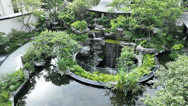 比如前庭铺装使用的浪淘沙,是著名的高档花岗岩;水庭园池底使用的安哥拉黑,是天然名贵石材,其美感独特且质地坚固。