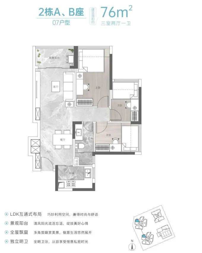 ③建面约76㎡是竖厅三房两厅一卫户型,结构比较传统,功能间布局合理,实用性比较强,比较适合预算有限的刚需家庭,预计这个户型会比较抢手。