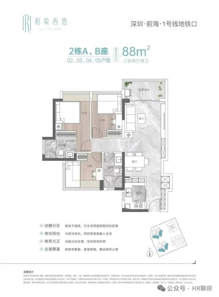 ⑤:建面约88㎡是竖厅三房两厅两卫户型,这个结构就是最长见的那种,说不上有什么优势,也没可吐槽的明显缺陷,目测它的得房率应该会比87㎡的高,毕竟飘窗面积更大了。