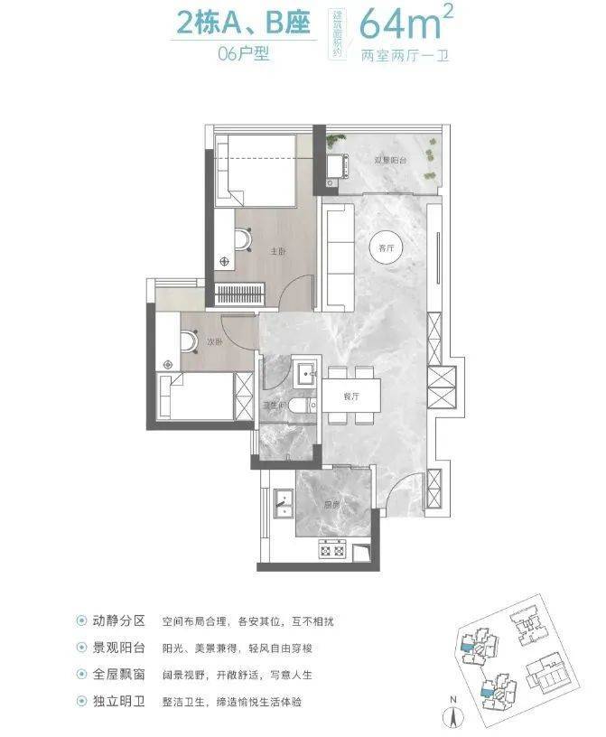 ②建面约64㎡是竖厅的两房两厅一卫户型,对比那个54㎡的户型,这个功能间布局就传统多了,多了10个㎡,同样也具有低总价优势。