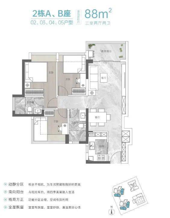➣亮点一:格局方正,空间利用率高,三/四开间朝南/景观面,让生活更近阳光