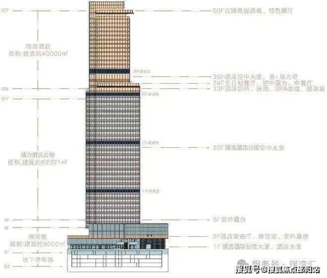 项目由华侨城集团开发,总占地面积约 7676 平方米,总建筑面积约 13.9 万平方米(含地下),计容建筑面积 10.7 万平方米。建筑为 230 米高、51 层的超高层塔楼 + 4 层裙房,其中 5-11 层为超甲级办公,20-31 层为酒店式行政公馆,33-50 层为深圳西部首家瑞吉酒店,裙房及地下一层为 “瑞湾荟” 精品商业。项目 2019 年开工、2024 年投用,总投资约 45 亿元,是宝安中心区标志性地标。