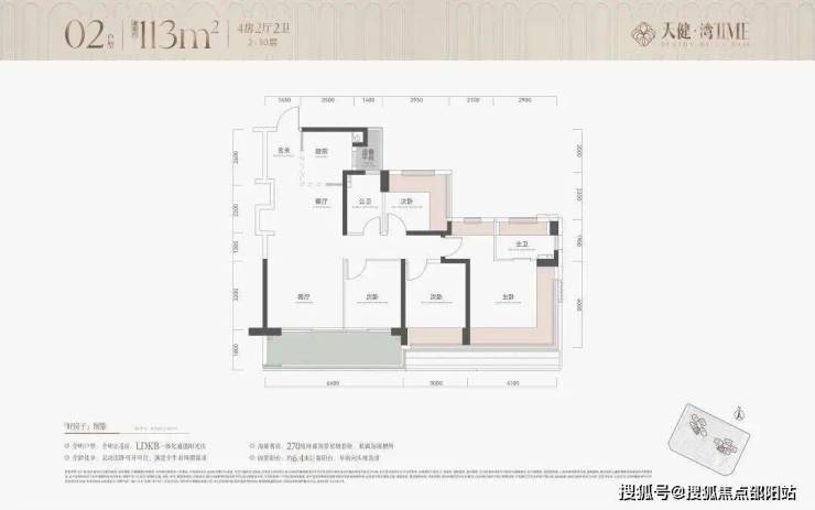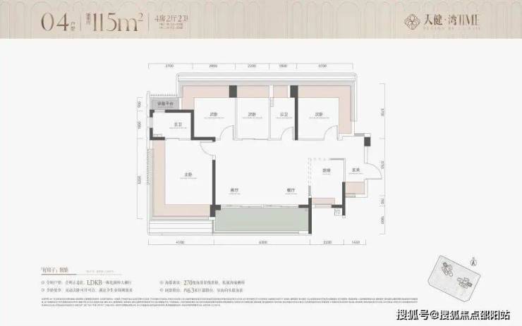 建面约113㎡正4房阳光户型LDKB一体化设计,灵动可开可合次卧设计满足家庭成长需求,约6.4m巨幕宽景阳台+270°环幕飘窗带来极目无界头排海景。