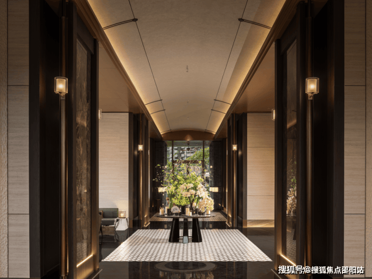 酒店式社区大堂:朝向广场,入口前场、门廊、大堂、内庭院、单元大堂组成的归家动线,配合建筑、景观、室内、标识、灯光一体化设计,汲取糅合后的南洋文化元素细节,把酒店式归家仪式感拉满,彰显非凡气度。
