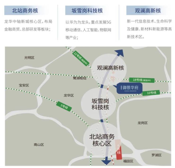 龙华十四五最新规划建设独具魅力的湾区中轴新城,以深圳北站商务核作为起点,向北辐射坂雪岗科技核、观澜高新核,打造纵贯南北的三大都市走廊核心。预计2025年,建成粤港澳大湾区现代化国际化创新型科技中轴新城,区域价值随之高涨。(引用龙华区十四五规划纲要)