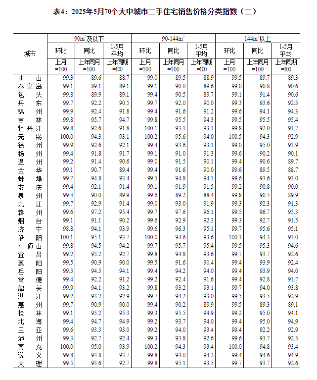 2025年5月份,70个大中城市中,各线城市商品住宅销售价格环比下降,同比降幅继续收窄。