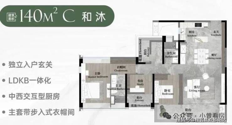 140平方和沐:(3+1)室2厅2卫,入户玄关+超大阳台+双套间
