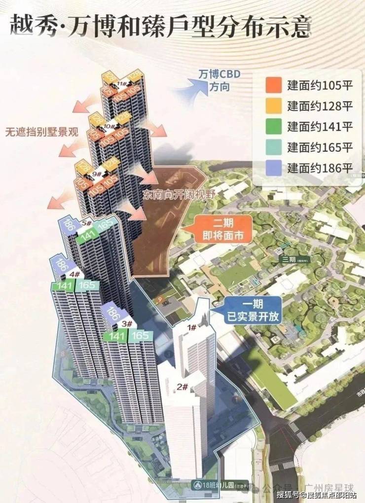 项目核心组团越秀万博和臻即将新推11栋,坐拥内外双园景观,主力户型仍是备受市场追捧的建面约105㎡四房。