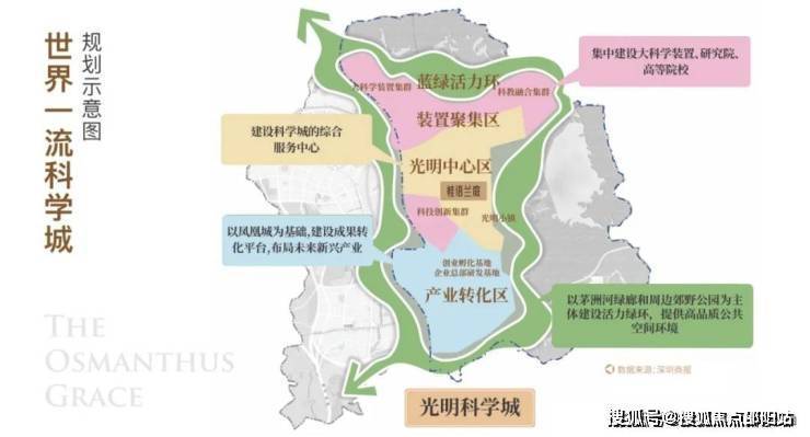 光明布局规划“一心两区”,“一心”即光明中心区,建设科学城的生活服务中心,集聚商业、居住、大型公共服务设施等顶级配套。