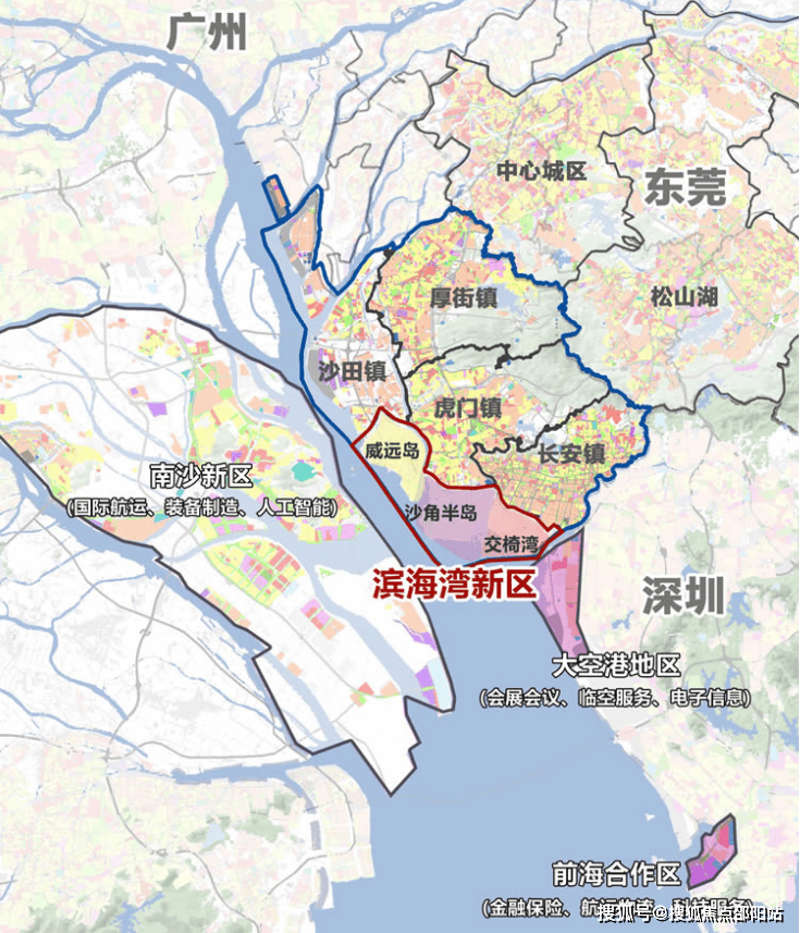 滨海湾片区拥有得天独厚的优越区位条件,位于广深两大核心城市之间的关键节点,南与深圳相邻(距离前海25公里),北靠东莞长安镇和虎门镇,西隔珠江与广州南沙相望,是粤港澳大湾区的几何中心。