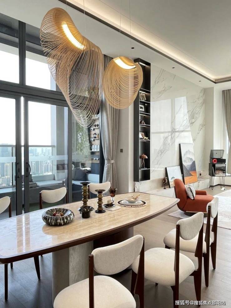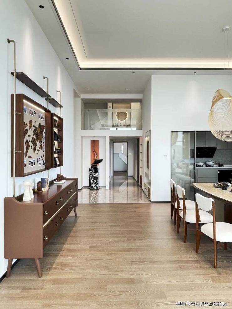 通道与餐厅之间的视觉重点是葡萄牙的家居品牌Mezzo的Lester餐柜,这款独特的餐柜是对50年代和60年代致敬,以现代方式重新诠释复古经典。意大利设计师的创意悬浮餐厅吊灯,以其独特魅力照亮空间。自由曲线的设计,灵动而优雅。搭配大理石餐桌和原木餐椅,增添自然质感。在这里用餐不只是简单的行为,更是一场享受创意与舒适的美妙体验。