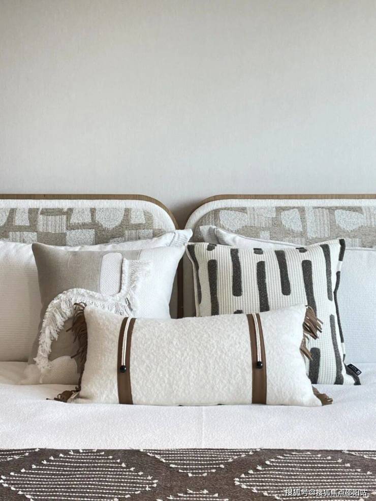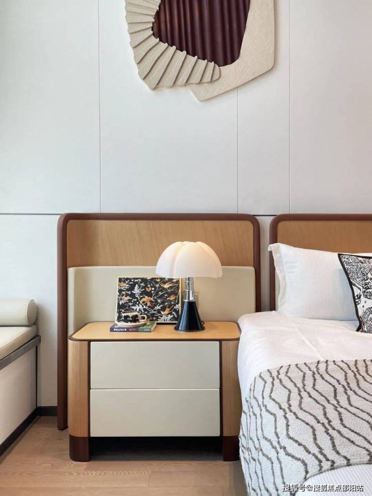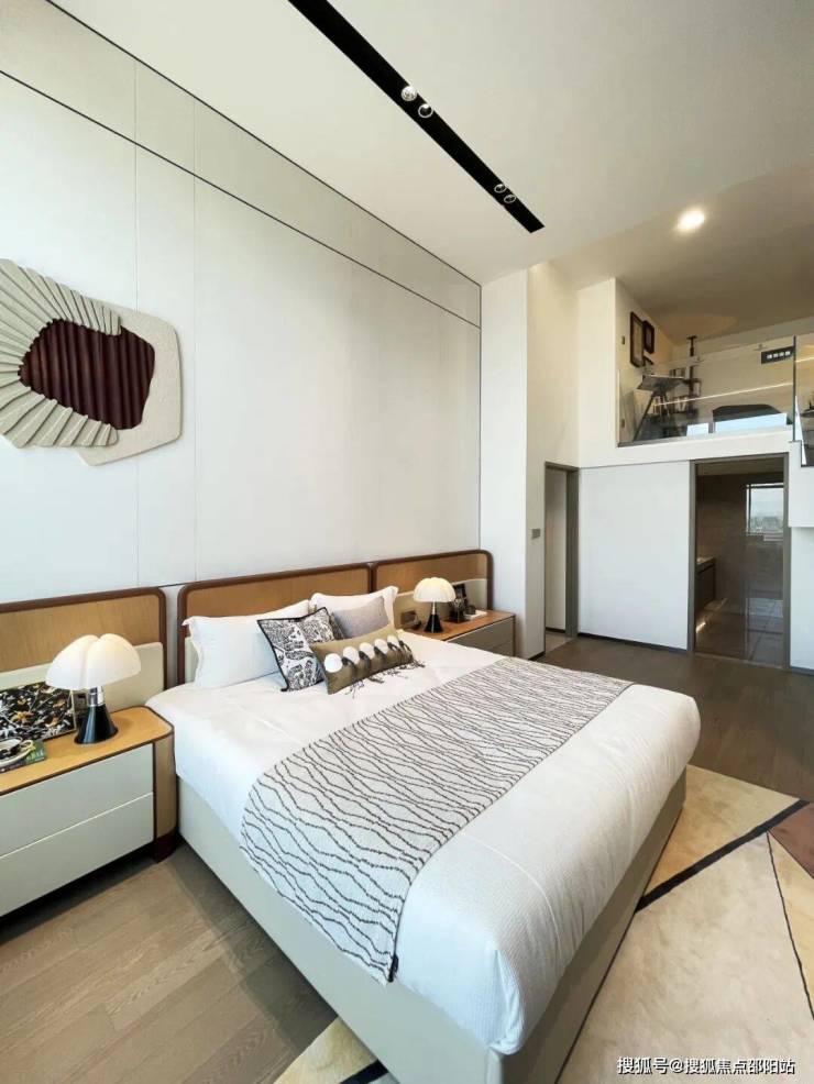 主卧室空间高挑,给人以舒畅之感。米色背景墙散发着柔和的气息,为整个房间奠定了温馨的基调。原木床架增添了自然的韵味,与整体风格相得益彰。视野开阔无比,城市景观尽在眼前,白天车水马龙,夜晚灯火辉煌。回到这里,仿佛所有的疲惫都被治愈,让人沉浸在这宁静而美好的氛围中,享受着属于自己的惬意时光。