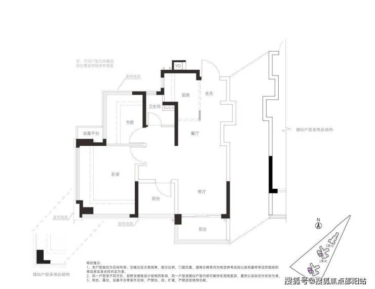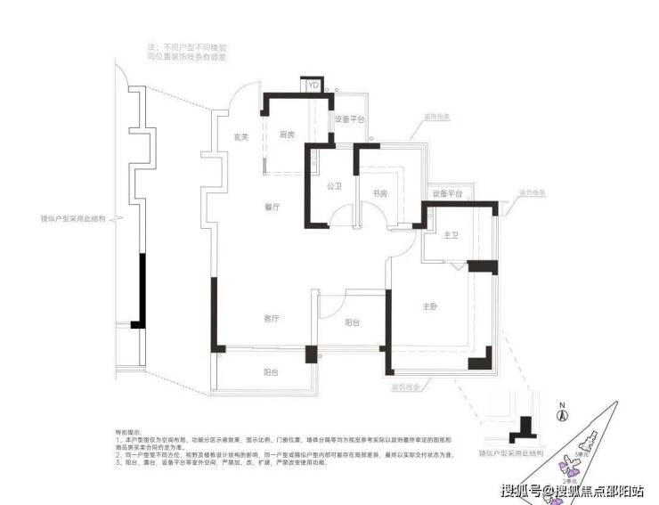 :竖厅设计,3.4 米大开间,主卧升级套房,双飘窗 + 设备平台,U 型厨房,干湿分离卫浴,满足三口之家及二胎家庭需求。
