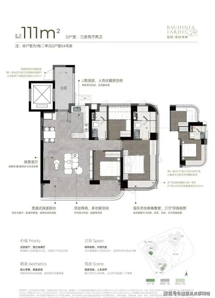从空间布局来看,U 型厨房的设计极为人性化,大开间客厅与宽阳台是整个户型的最大亮点,西南向视野使得整个户型采光充足,贯通式阔景阳台与客厅、卧室双通,极大地拓展了生活空间的宽度。主卧的飘窗台也是一大亮点,弧形无柱转角飘窗不仅提供了广阔的视野,还增加了室内的采光。