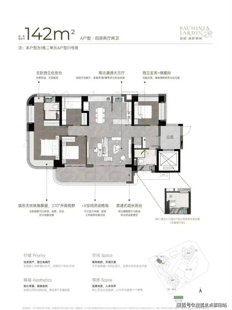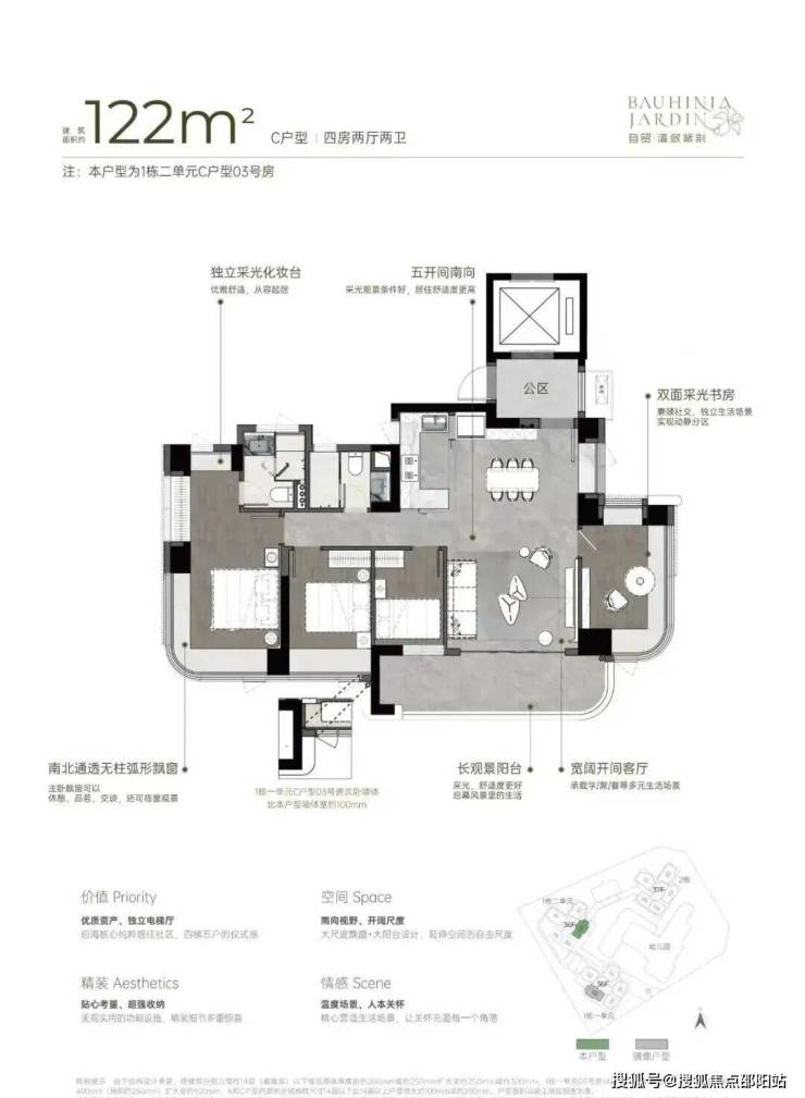 双龙抱珠户型,书房分布于客厅另一侧,且难得是双面采光+270°景观视野。主卧南北通透,且拥有十分开阔的景观面。贯通式阳台联通客厅以及靠近动区的次卧,实现长观景阳台