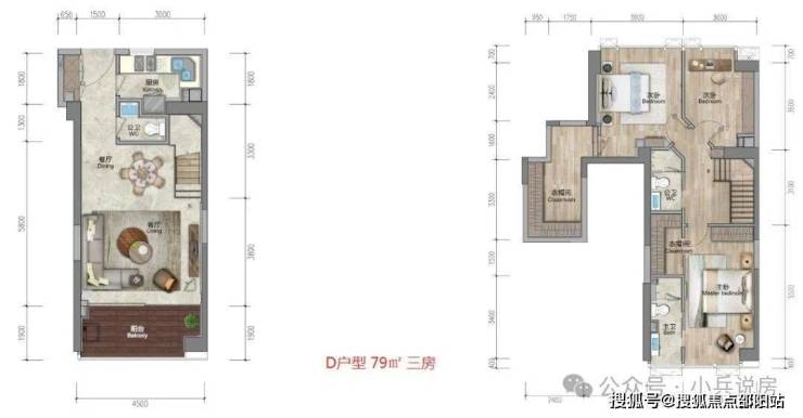 ★79㎡复式三房两厅三卫 南北通透,5.4米大开间,复式下层餐厨客厅连宽景阳台,另带一个法式小阳台。复式上层私密卧房全明采光,动静分区私享个性生活。另一个次卧带衣帽间。