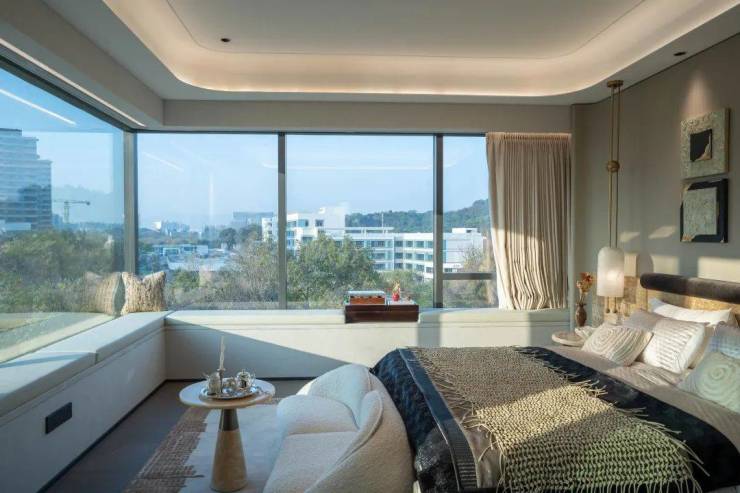 约 45 平的总统主套,以 7.5 米面宽打造 "寝居 - 衣帽 - 卫浴" 黄金三角,堪称家族私享的湖居行宫;约 28 平的湖景次套房,12 米环幕飘窗更实现 "睁眼即湖景" 的诗意日常。