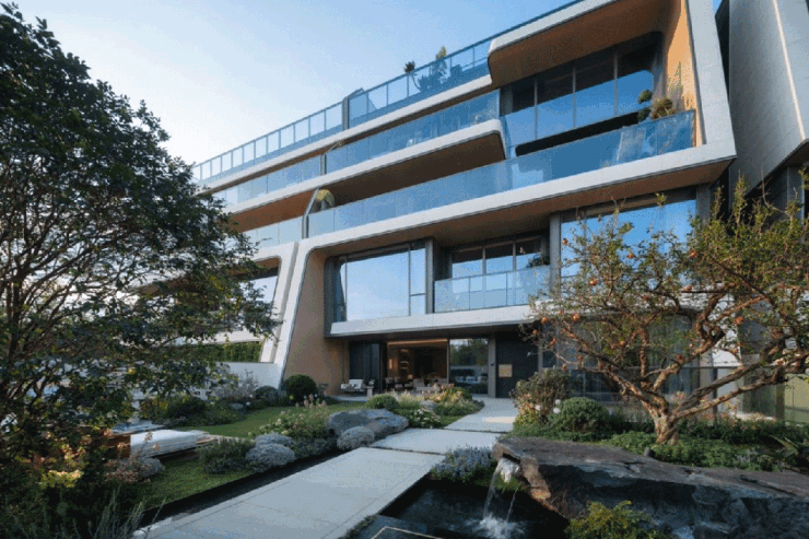 约 25 米超长景观界面与约 15 米 L 型巨幕转角阳台,如 "自然引景器" 般,将湖景引入生活,尺度堪比私人度假区。