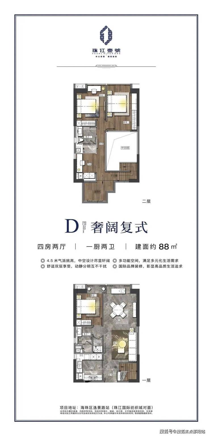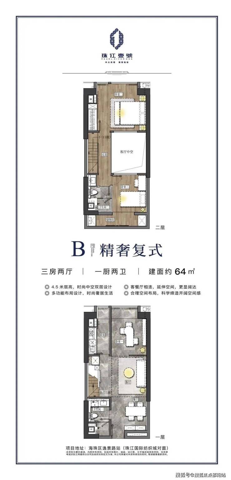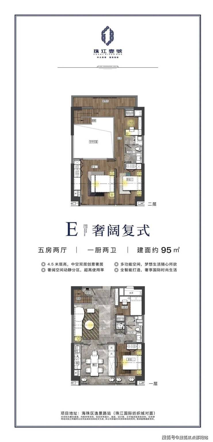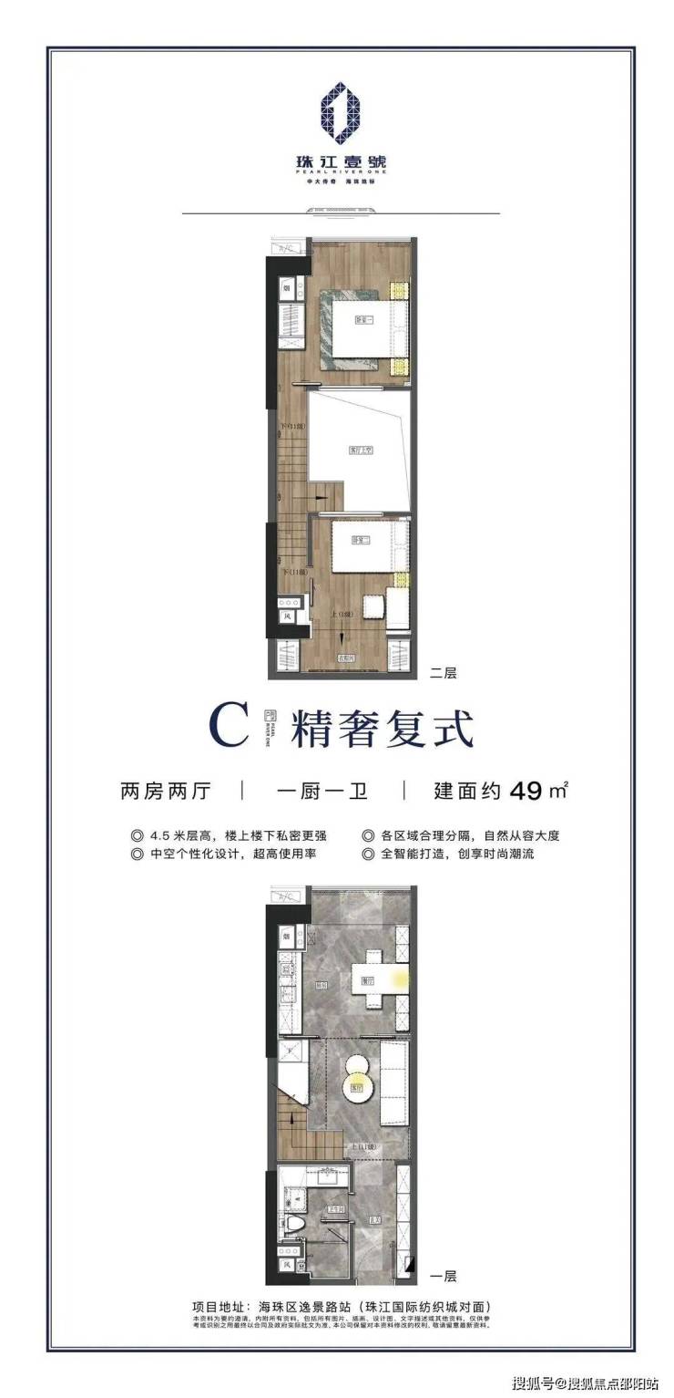 【项目概况】开发商:珠江投资集团物业公司:缦合物业,破亿豪宅同款物业占地面积:约3.7万㎡建筑面积:约31万㎡,LOFT空间约6.8万㎡LOFT层高:约4.5m中空挑高复式面积段:49-95㎡二至五房总户数:875套梯户比:10梯35户层数:共34层(仅25个标准层)拿地时间:2005年交楼时间:2023年6月(预计22年10月可交付)产权年限:50年装修:精装修【交通配套】 5站珠江新城,5站琶洲 11号线逸景路站正上,现场可以看到地铁站正紧锣密鼓施工中。11号线作为大环线,串联起天河、越秀、荔湾、海珠、白云五大中心区,预计将于2022年通车。 项目坐落于2000亿中大商圈之核,与珠江新城、琶洲两大城市CBD,共筑广州商业黄金三角。中大国际创新谷,依托中山大学、中国科学院南海研究所等前沿资源打造重大国际创新谷,将成为集合科研总部、科技孵化、商务配套功能于一体的高品质创新科技集聚区。未来,中大商圈将以中大国际创新谷的全新风貌展现在世界面前,成就比肩世界的“广州硅谷”。珠江壹號凭借其不可复制的核芯地理位置,将成为炙手可热的当红明星。大体量商业旗舰,城芯风向标除了地标的稀缺价值、地铁物业价值之外,珠江壹号还坐拥一站式高端配套等多重优势,万达广场、合生广场以及珠江壹号自带的7万㎡时尚MALL举步即达,汇集全球时尚娱乐休闲,高端餐饮美食,文体商务等全配套生活业态,开启万千精彩生活。