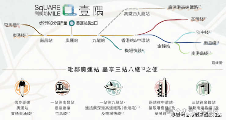 「利奥坊.壹隅」位于西九核心黄金圈,邻近兴中九龙干线,约9分钟车程直达东九龙CBD,约5分钟车程直达西九龙ICC,约9分钟车程达中环ifc。中九龙干线采用双程三线分隔车道的设计,连接西九龙的油麻地交汇处与东九龙的启德发展区和和九龙湾道路网。繁忙时间取道干线来往西九龙与九龙湾商贸区的车程约5分钟。