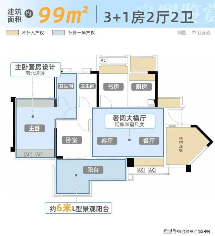 建面约99平,全屋被不及产权面积的空间重重包裹着,别人是送次卧,星晨·君悦湾直接送了一个客餐厅面积。约6米长阳台还不够,直接给你做成L型阳台设计,宛若270°观景台。U型厨房本身足够宽敞,还多送了3平空间。该户型少承重墙设计,全屋改造性相当灵动。可以保留奢阔大横厅,大面宽采光;也可以将餐厅位置改成一间卧室,厨房与原书房改成餐厅一体化设计,形成南北对流。