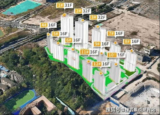 总共设计了12栋楼,北面三栋高层,1栋31层,2、3栋32层,均为两梯四户,全南向设计。 其余9栋皆为小高层,都是16层高,南北对流设计。