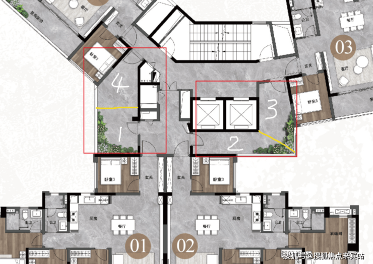 不过呢,如果你是买板楼,那分割平台花园到不难,因为面积和格局基本是对称的,可以很好的分配。不信,来看看下面4栋的户型图!