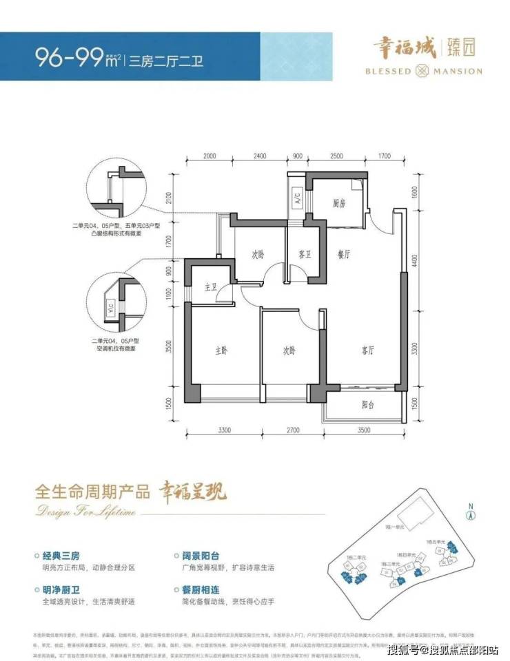 👉建面约96-99㎡3房2厅2卫 多数户型三开间朝南 阳光充盈全屋空间