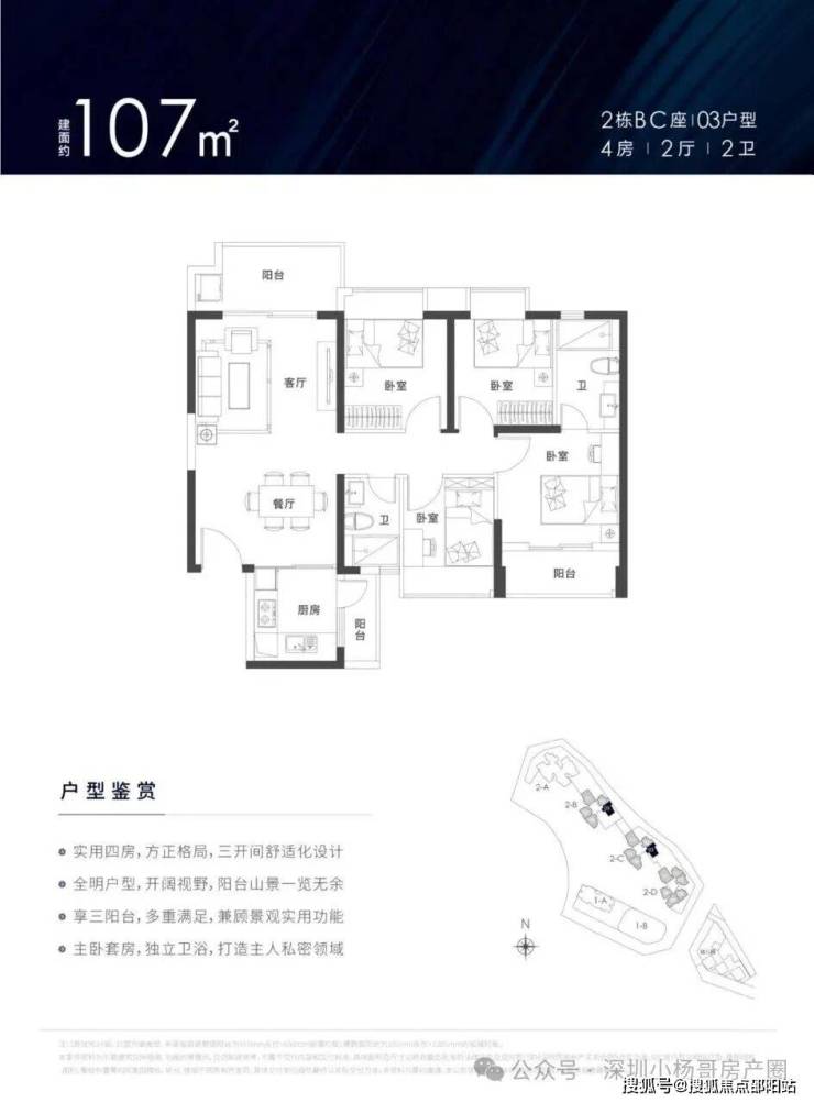 107㎡的4房2厅2卫,设计的竖厅格局,客厅主卧双阳台设计,厨房也带小阳台,客厅朝东北向,高层可看水库景观。