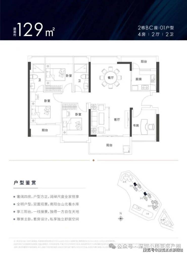 129㎡的4房2厅2卫,设计的竖厅南北通透格局,客厅主卧双阳台设计,厨房也带小阳台,客厅朝西南向,高层可享受双面景观。