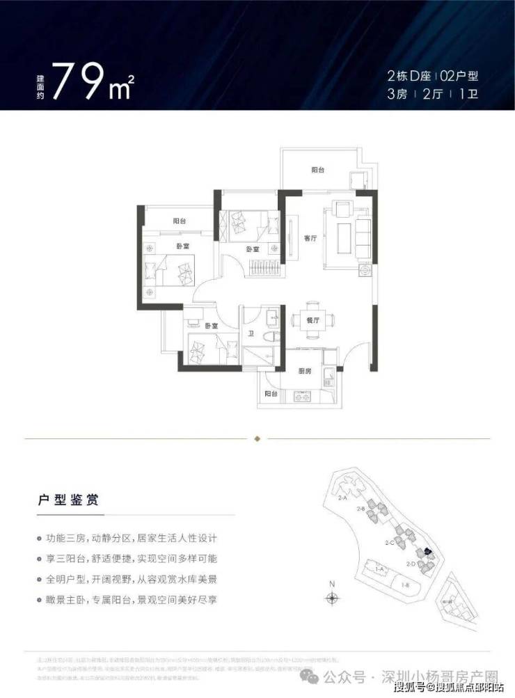 79㎡的3房2厅1卫,设计的竖厅格局,厨房带小阳台,客厅东北朝向,高层可看水库景观。