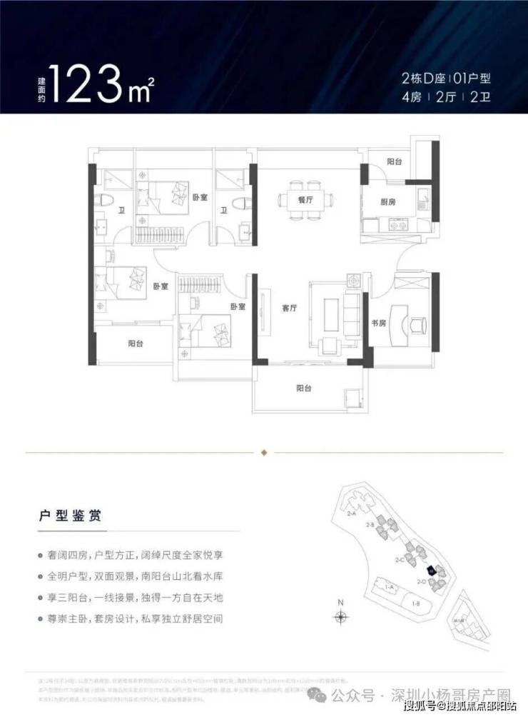 123㎡的4房2厅2卫,设计的竖厅南北通透格局,客厅主卧双阳台设计,厨房也带小阳台,客厅朝西南向,高层可享受双面景观。