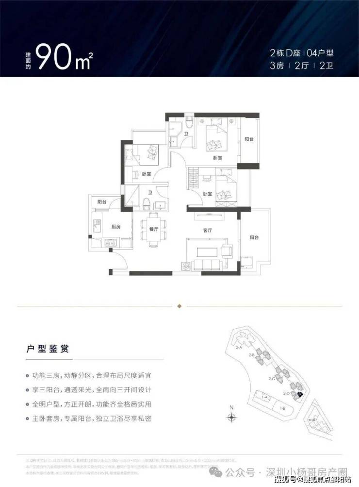 90㎡的3房2厅2卫,设计的竖厅格局,客厅主卧双阳台设计,厨房也带小阳台,三开间朝南,客厅朝东南向。