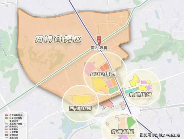 根据规划,整个万博城大致可以分为4个组团,每个板块特性不尽相同:CBD组团、东/西部组团、南部组团三部分。