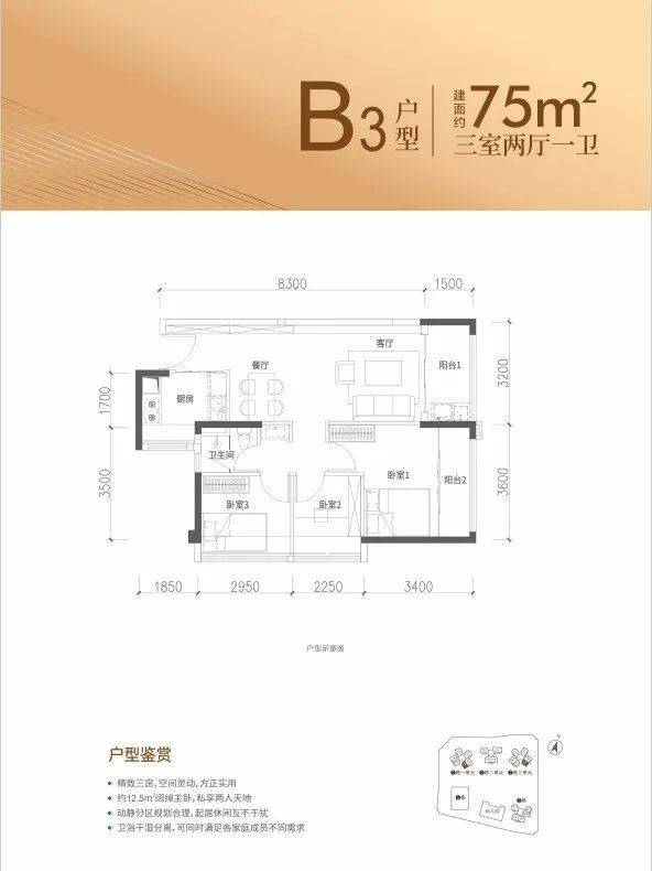 特点:LDKB一体化设计,主卧11.3㎡(含飘窗),次卧7.28㎡(含飘窗)x2。