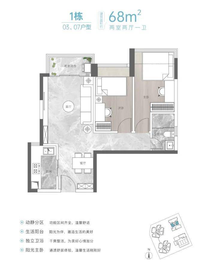 ②建面约64㎡是竖厅的两房两厅一卫户型,对比那个54㎡的户型,这个功能间布局就传统多了,多了10个㎡,同样也具有低总价优势。