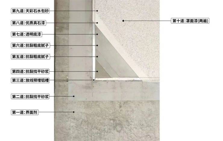 项目采用10道工序精细化施工(详见下图),以提升外墙防水性能, 避免砖砌体墙开裂产生的渗水、漏水隐患以及光污染。