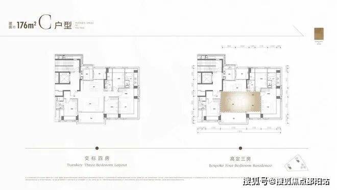 176㎡户型原报建是四房三卫(双套间)的南北通透户型,客厅开间5.7米,「招商海晏府」的定制方案是去除一个次卧2,打通成为茶室。