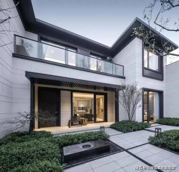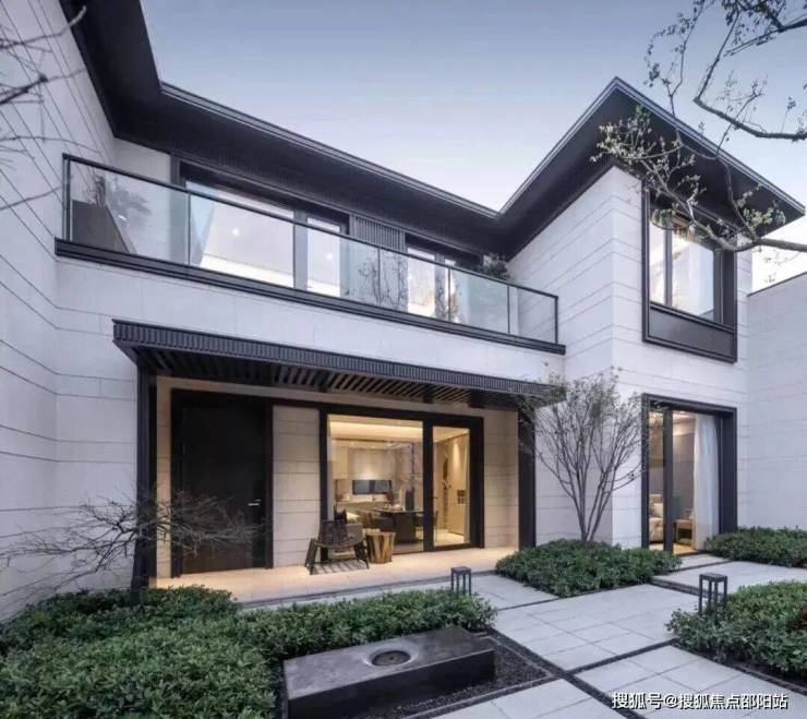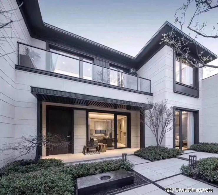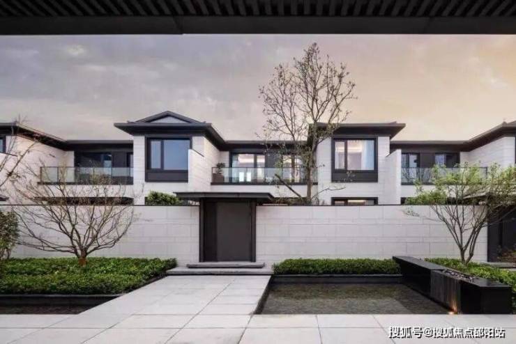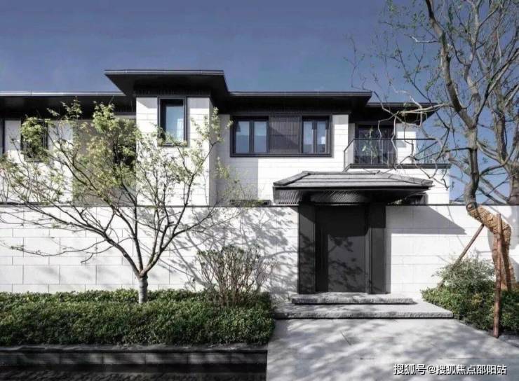 山水拾间的屋顶坡度采用类似于传统古建的屋顶“三五举”,整体坡度约33%。屋顶瓦片清一色深色,营造了江南水乡似的氛围。外立面则采用了现代设计手法,灰墙黛瓦中,有大面积的留白,整体给人的感觉十分优秀。
