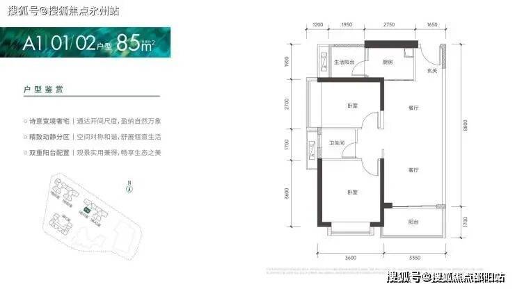 85㎡的2房2厅1卫:设计的是竖厅格局,客厅3.35米开间,进门入户玄关,LDKB一体化设计,2个卧室分别做到了3.6米/2.7米的宽度,L型厨房还带1个小生活阳台,卫生间干湿分离,得房率:72.37%(不含赠送),阳台朝西南向。